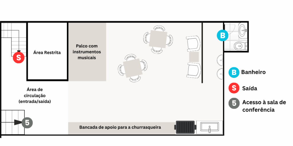 - Acesso estratégico à sala de conferência — perfeito para integrar apresentações, workshops e eventos corporativos com comes e bebes